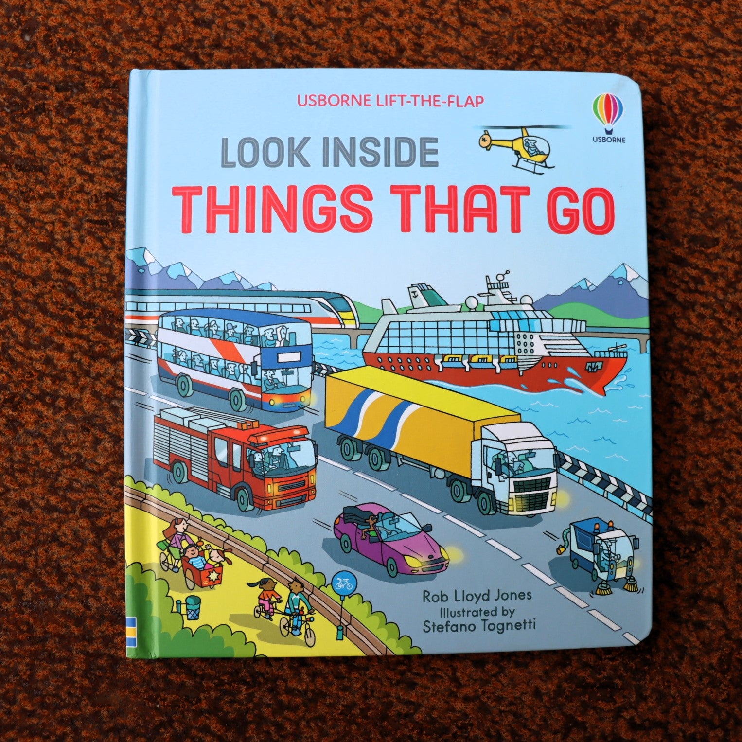 Lift the many flaps in this sturdy, interactive thin board book to discover what happens inside boats, bikes, planes, cars, buses and more.