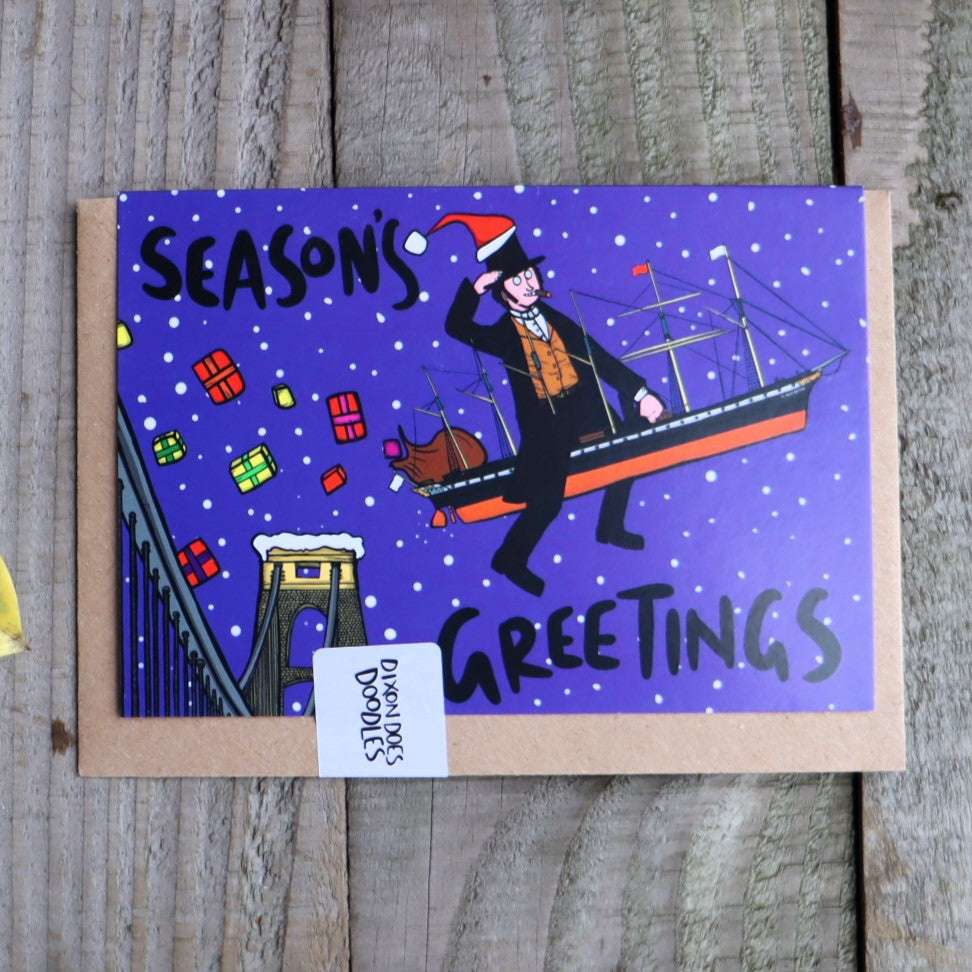 This funky and colourful Christmas card is perfect for fans of Brunel and locals to Bristol. It features Brunel flying over the Clifton Suspension Bridge on the SS Great Britain, delivering presents to the people below (and possibly dropping a few!)