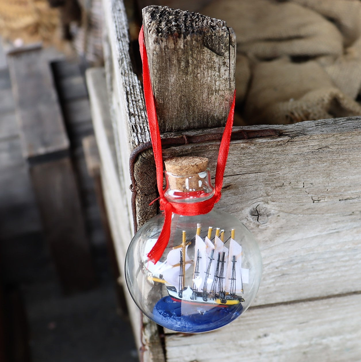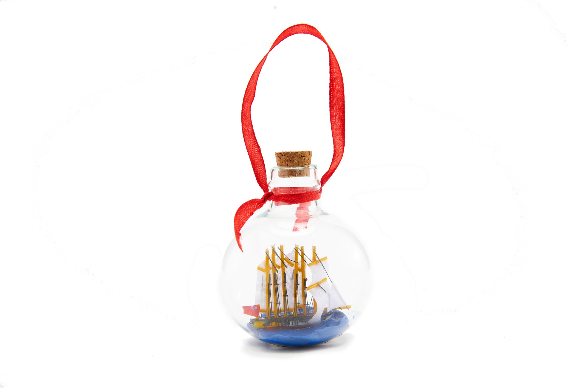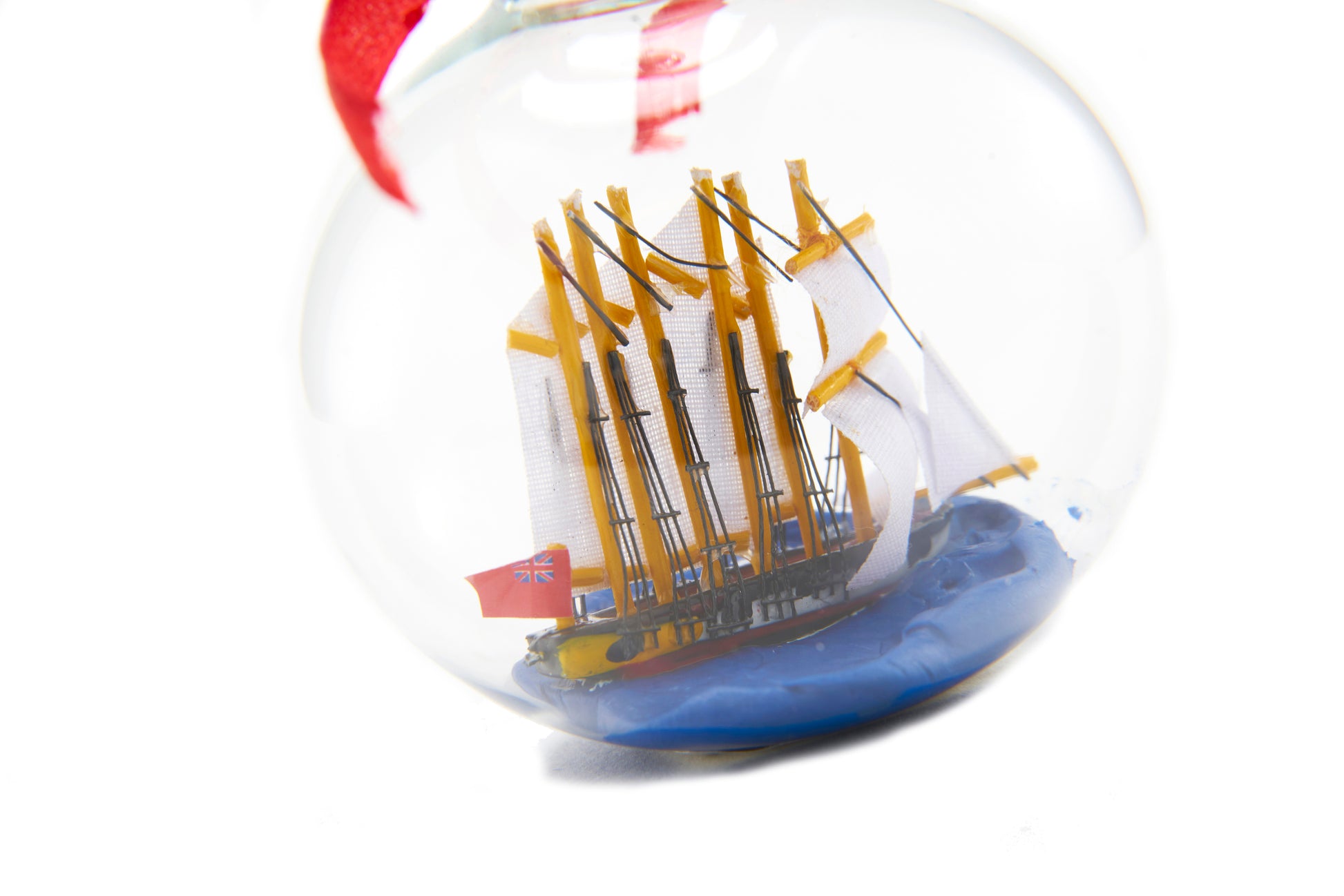 A message in a bottle with a difference. A tiny model of the SS Great Britain fits inside this glass globe, tied at the top with a red ribbon and closed with a cork.