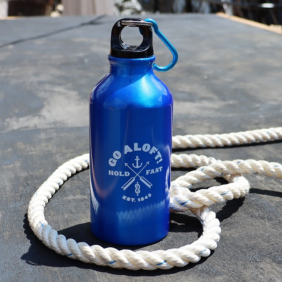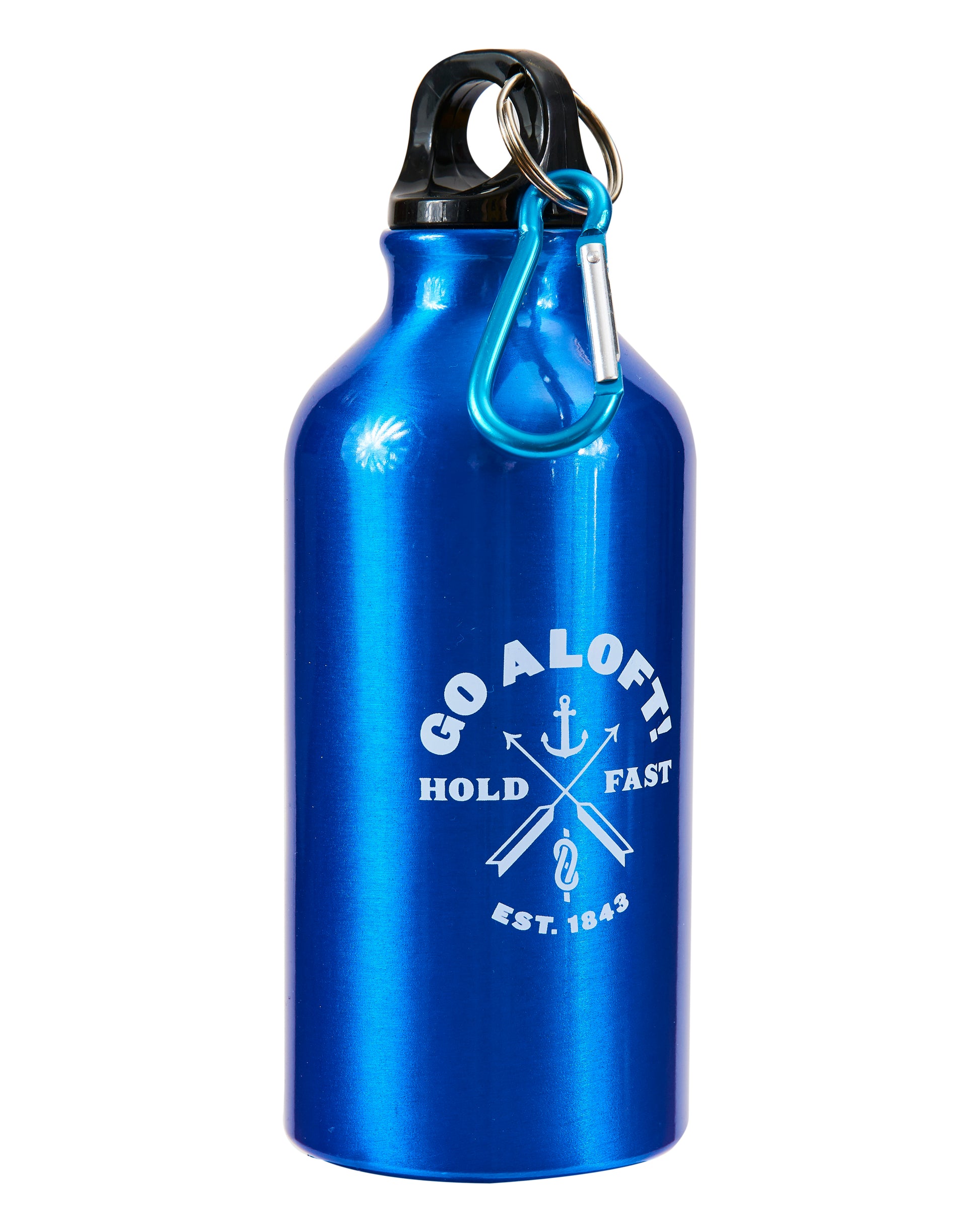 This handy sized metal flask is a metallic blue with the Go Aloft! logo on it in white. The bottle comes with a karabiner style clip, perfect for adventures!