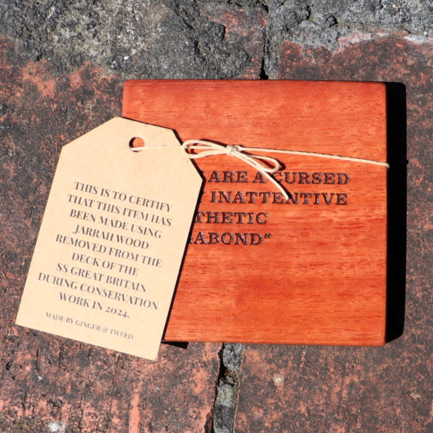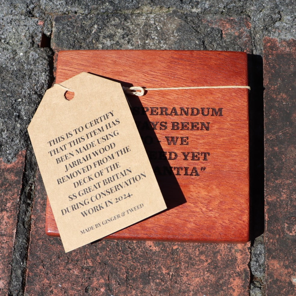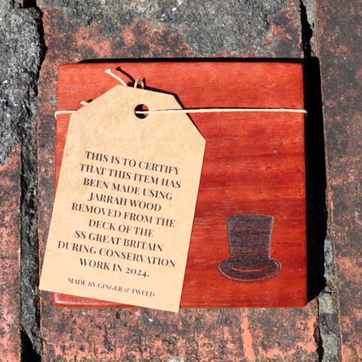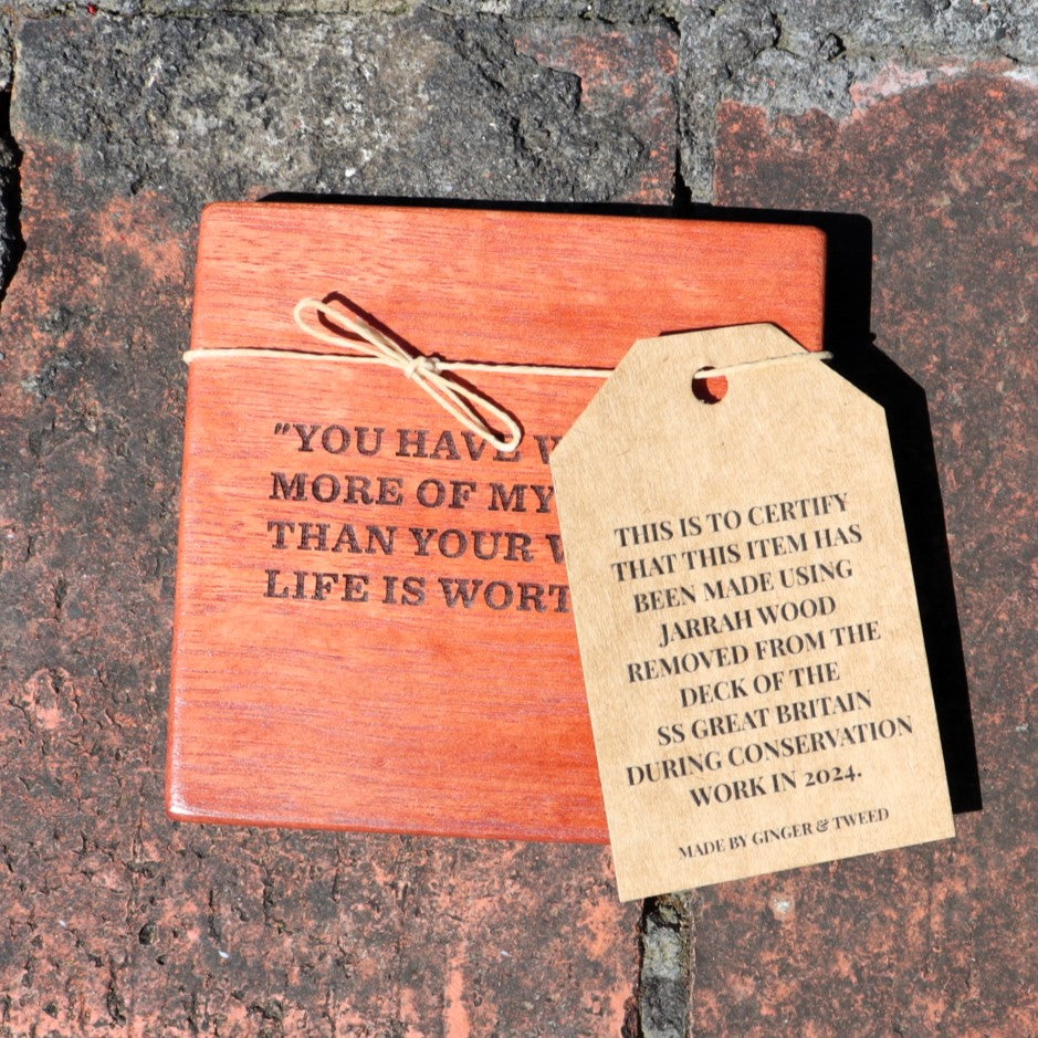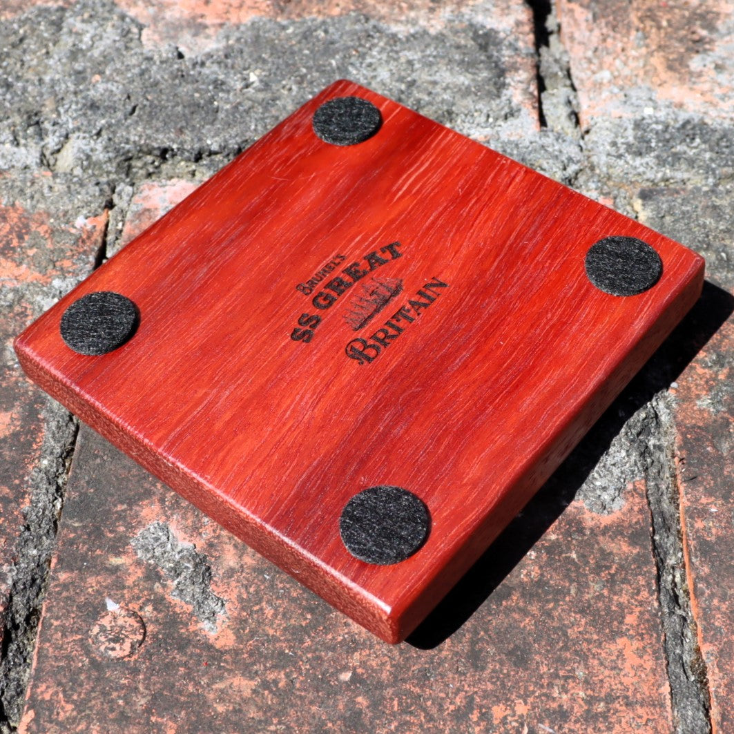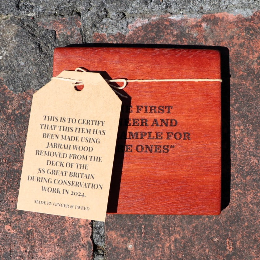 Rest your hot drink on a piece of history with one of these stylish coasters, made from sections of the SS Great Britain's deck. Each coaster has been hand cut, treated and engraved with either a stovepipe hat or one of four Brunel quotes (some inspiring, some less so!)
