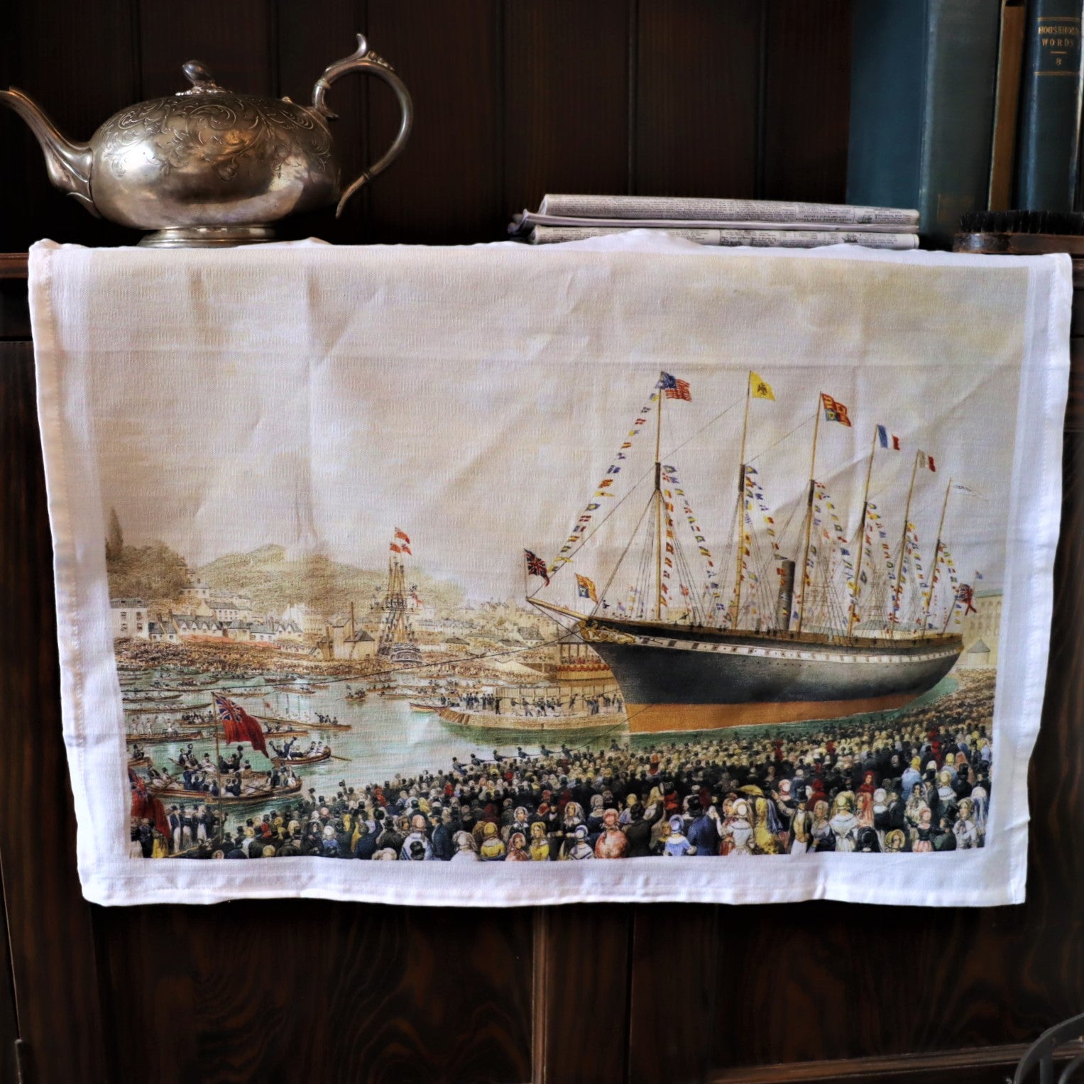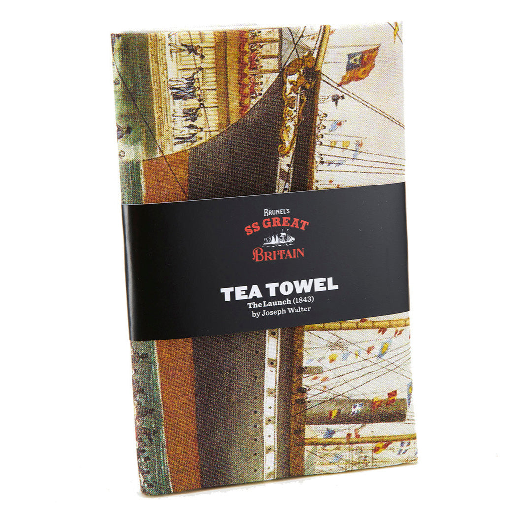 This tea towel features a reproduction of Joseph Walter's contemporary watercolour 'The Launch', depicting the SS Great Britain in the floating harbour, decorated to celebrate her launching day.