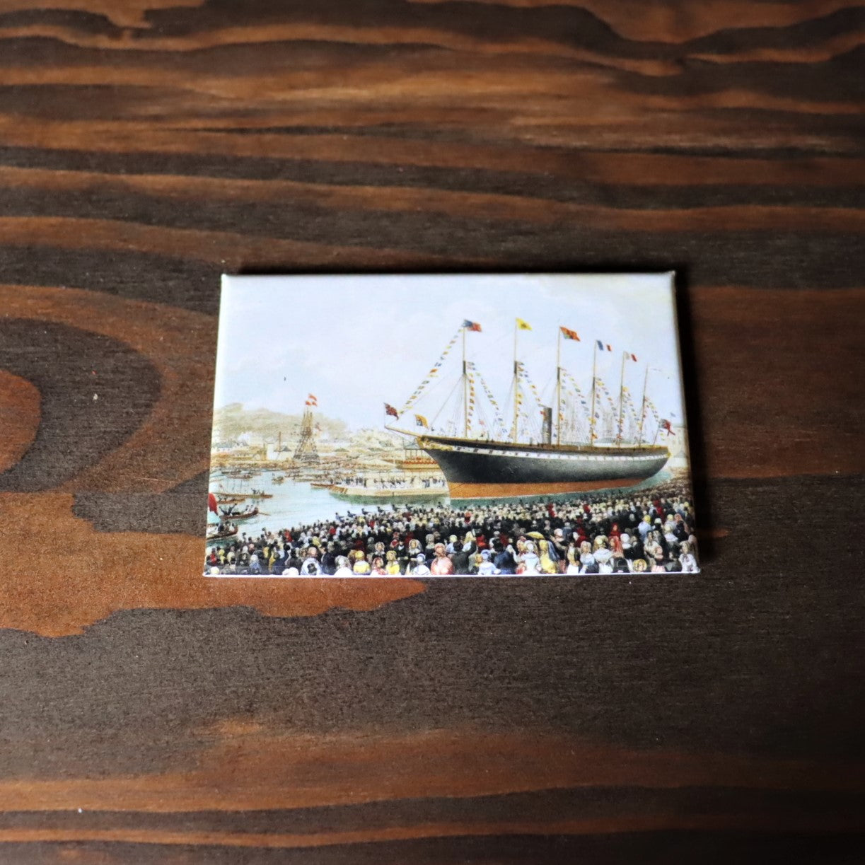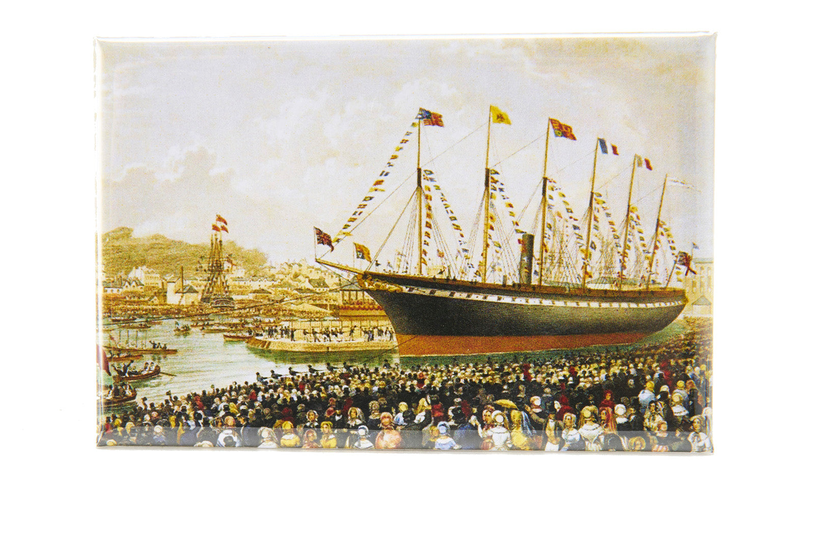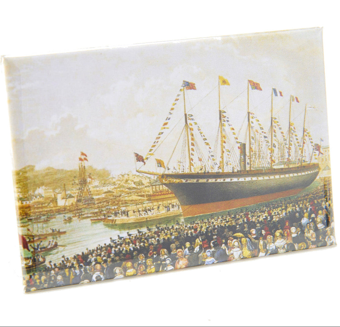 Brighten up your fridge with this magnet, featuring our ever popular Launch design. This reproduction of Joseph Walter's contemporary watercolour 'The Launch' depicts the SS Great Britain in the floating harbour, decorated to celebrate her launching day. This magnet makes the perfect gift for fans of this beautiful ship.