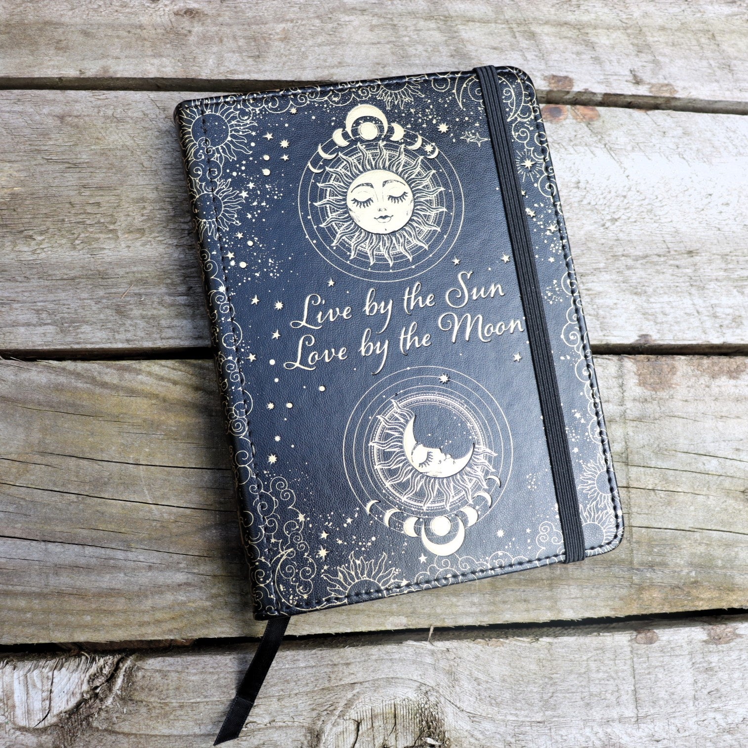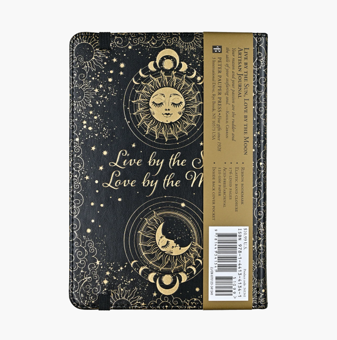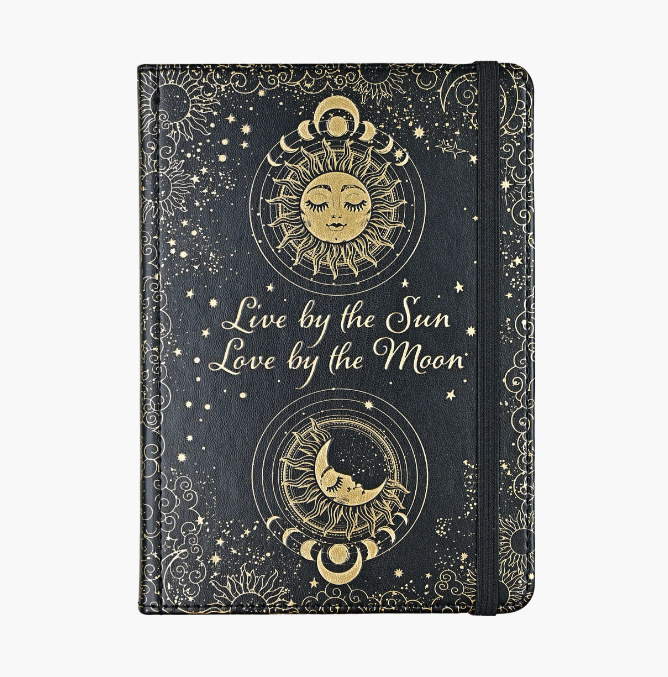 This elegant journal features a soft vegan leather cover, decorative stitching and embossing, and a sun and moon design, with the words ''Live by the Sun, Love by the Moon,'' embellished with gold foil.