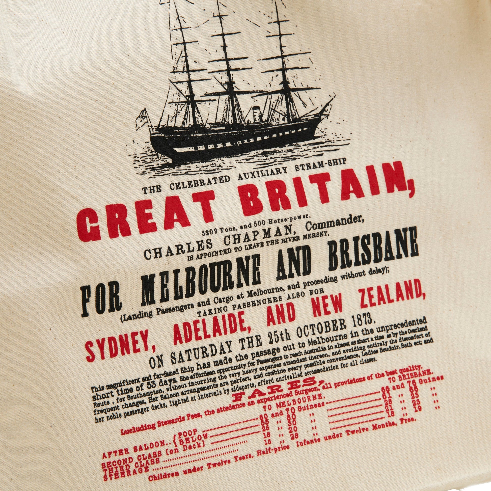 This quality canvas tote bag is a great way to cut down on plastic bag waste, while also featuring a classic design. This bag features a real Victorian advert from 1865, held in the SS Great Britain Trust collection, which promoted the record-breaking journey time of the SS Great Britain to Australia. The long carry handles (58cm) mean it’s easy to sling over shoulders and carry the weight of a big family shop.