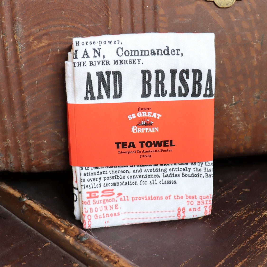 A quality tea towel depicting a real Victorian advert from 1865, which is held in the SS Great Britain Trust collection. Promoting the record-breaking steam from Liverpool to Australia, it's a reminder of the extraordinary feat of the SS Great Britain. With its striking, almost retro design, this tea towel will brighten up your kitchen and is a great souvenir of a visit to the ship.
