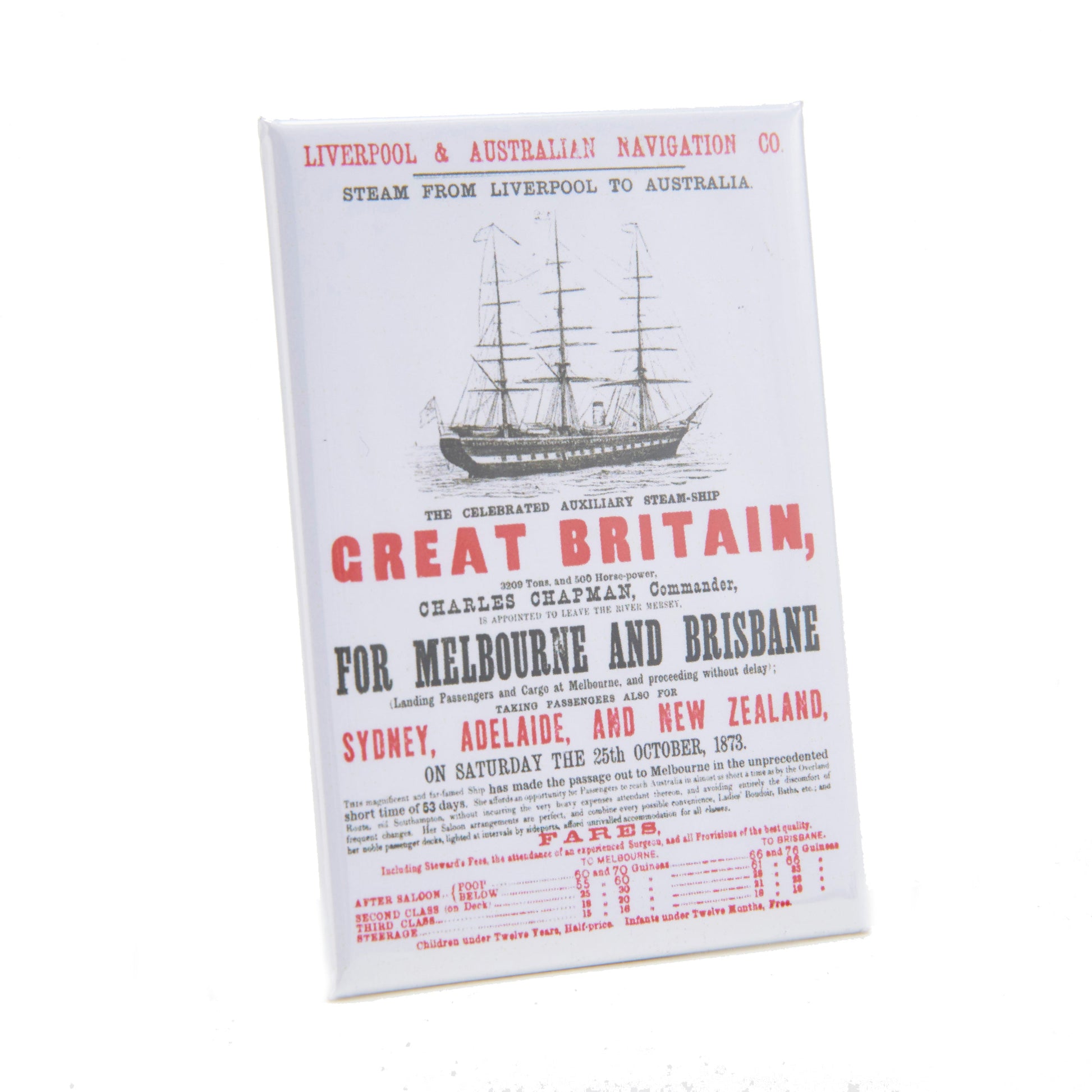 Brighten up your fridge with this magnet, featuring our ever popular Melbourne design. This iconic Victorian advertising poster is held in the SS Great Britain Trust collection, and is a reminder of the extraordinary feat of the ship herself. This magnet makes the perfect gift for fans of this record-breaking ship.