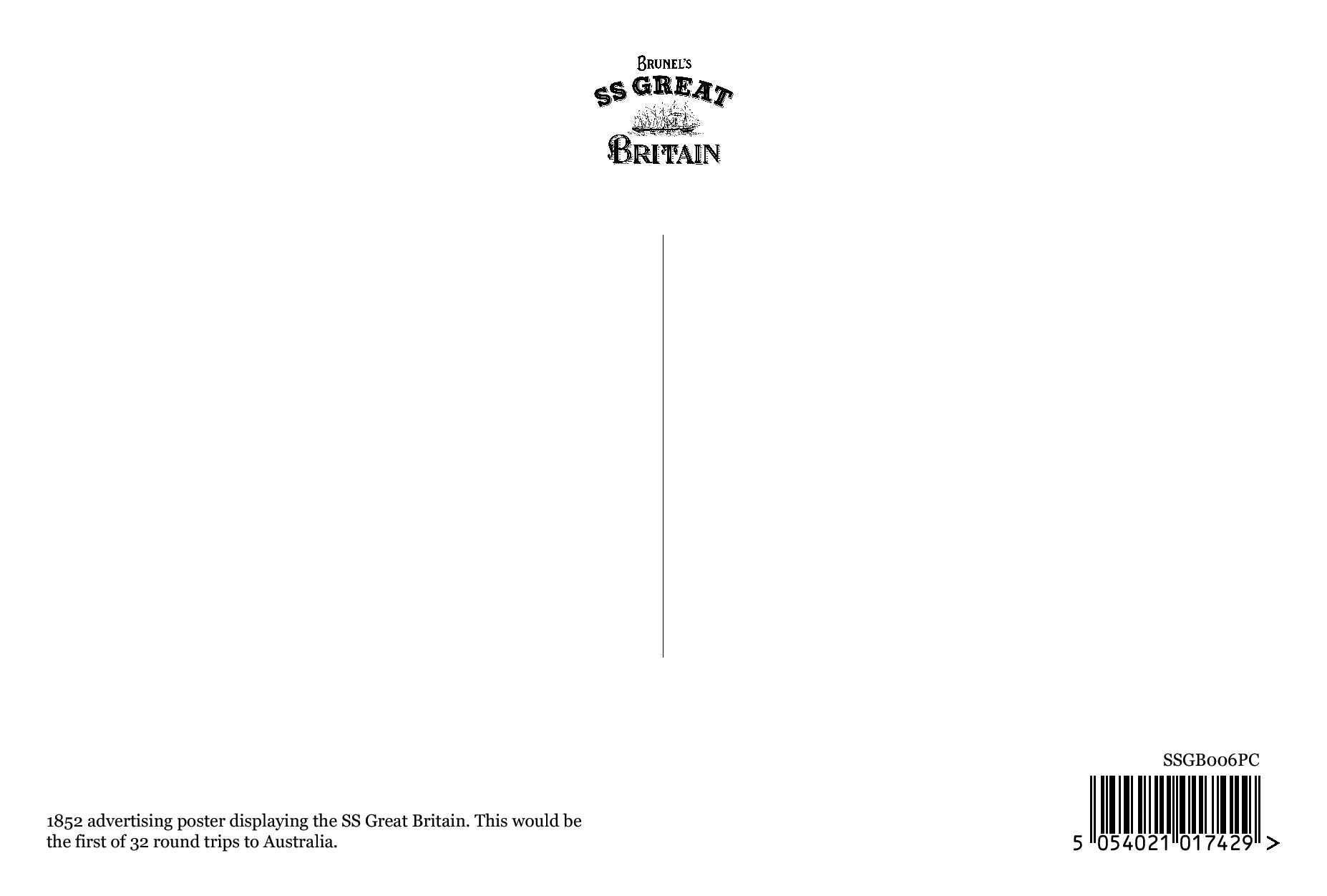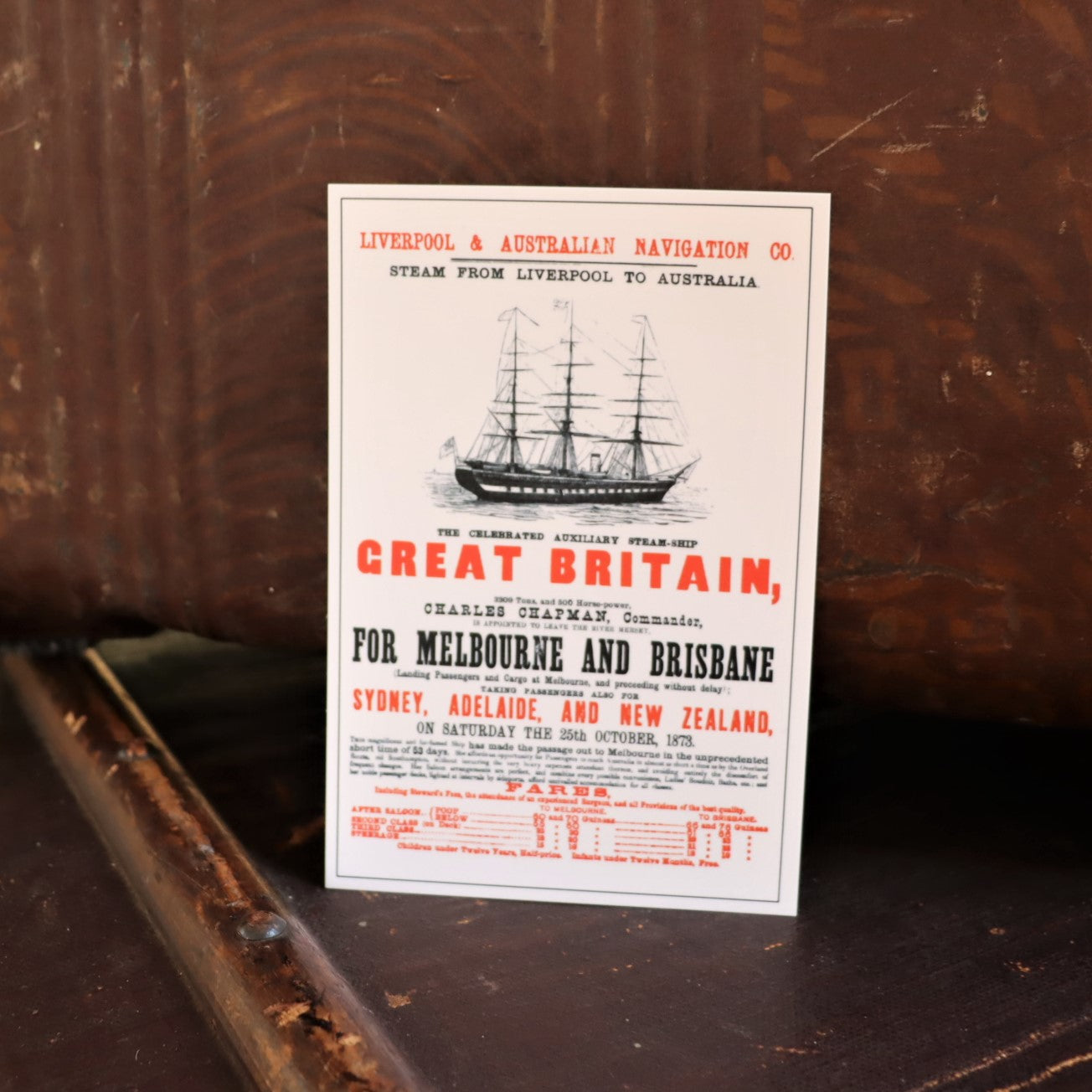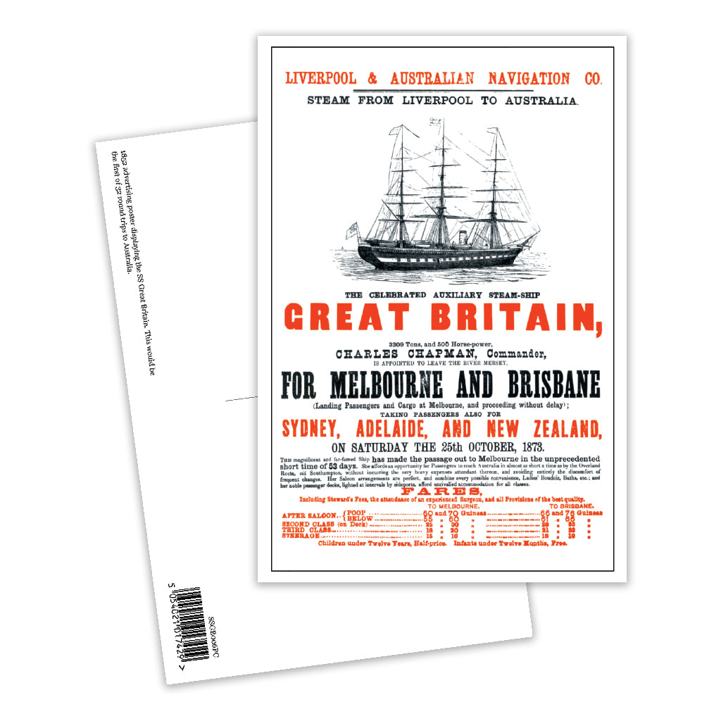Send greetings from Melbourne, or from anywhere in the world with this eye-catching postcard design! This postcard has been designed using a real Victorian advert from 1865, held in the SS Great Britain Trust collection. Promoting the record-breaking steam from Liverpool to Australia, it's a reminder of the extraordinary feat of the SS Great Britain.