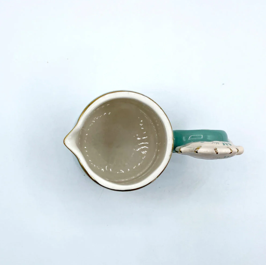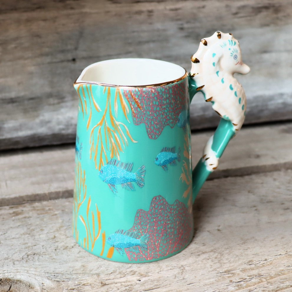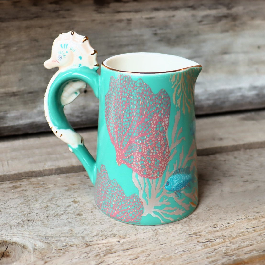 Elevate your breakfast table or kitchen decor with this pretty milk jug. The sea green design features a coral and fish pattern, with a ceramic seahorse wrapped around the handle.