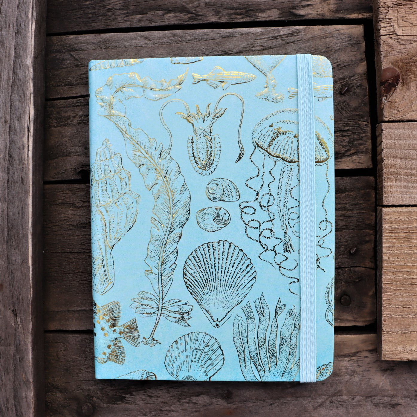 The durable aqua hardcover binding is embossed with gold foil images of seashells, fish and crustaceans. An elastic closure keeps your ideas safe and the inside back cover hides a handy pocket for keeping mementoes.