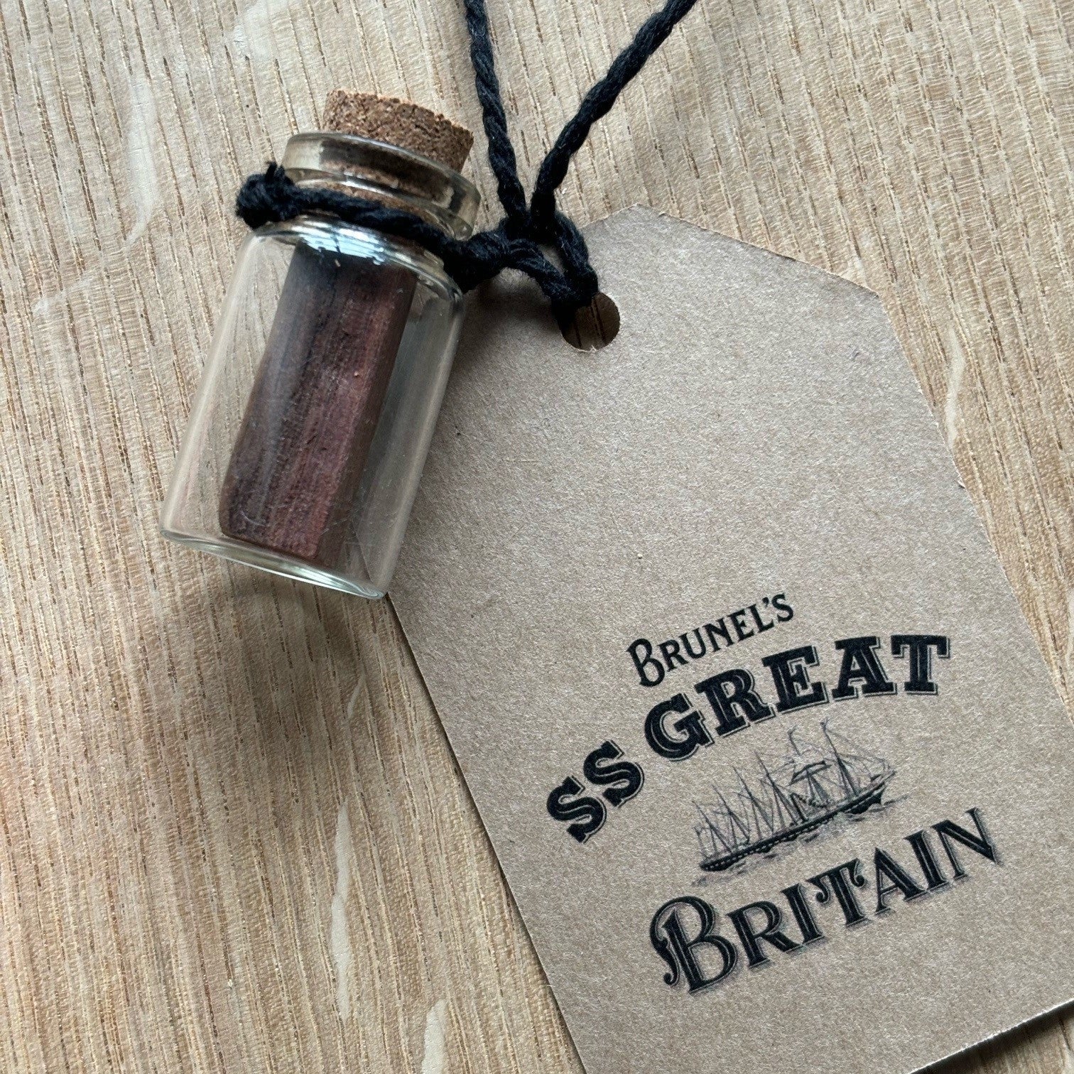 Take home a tiny piece of the ship's ongoing conservation with this [bit of a] ship in a bottle! This small glass jar contains a fragment of the SS Great Britain's deck from the 1990s, removed during conservation work in 2024.