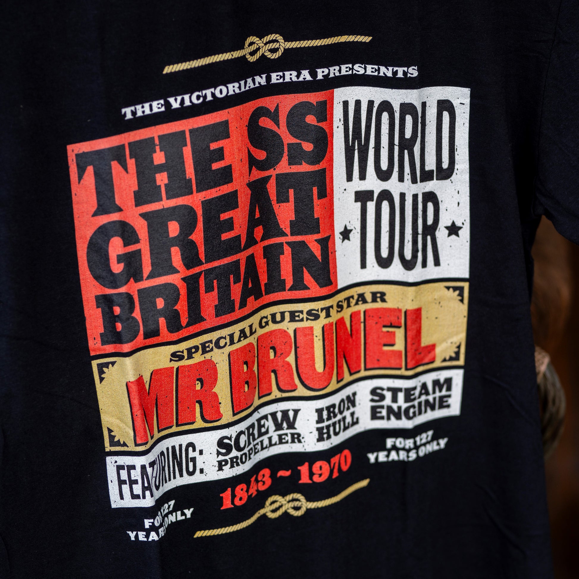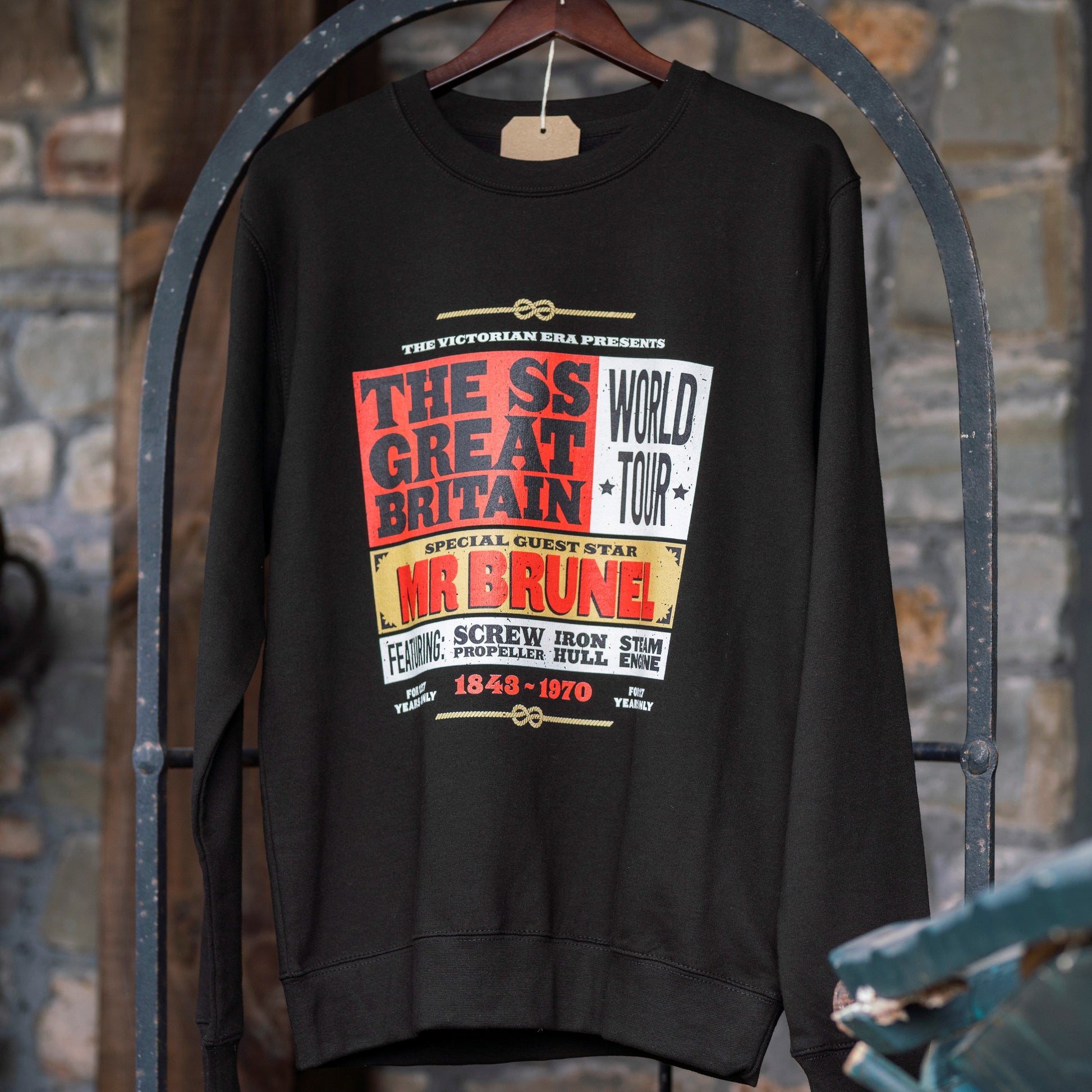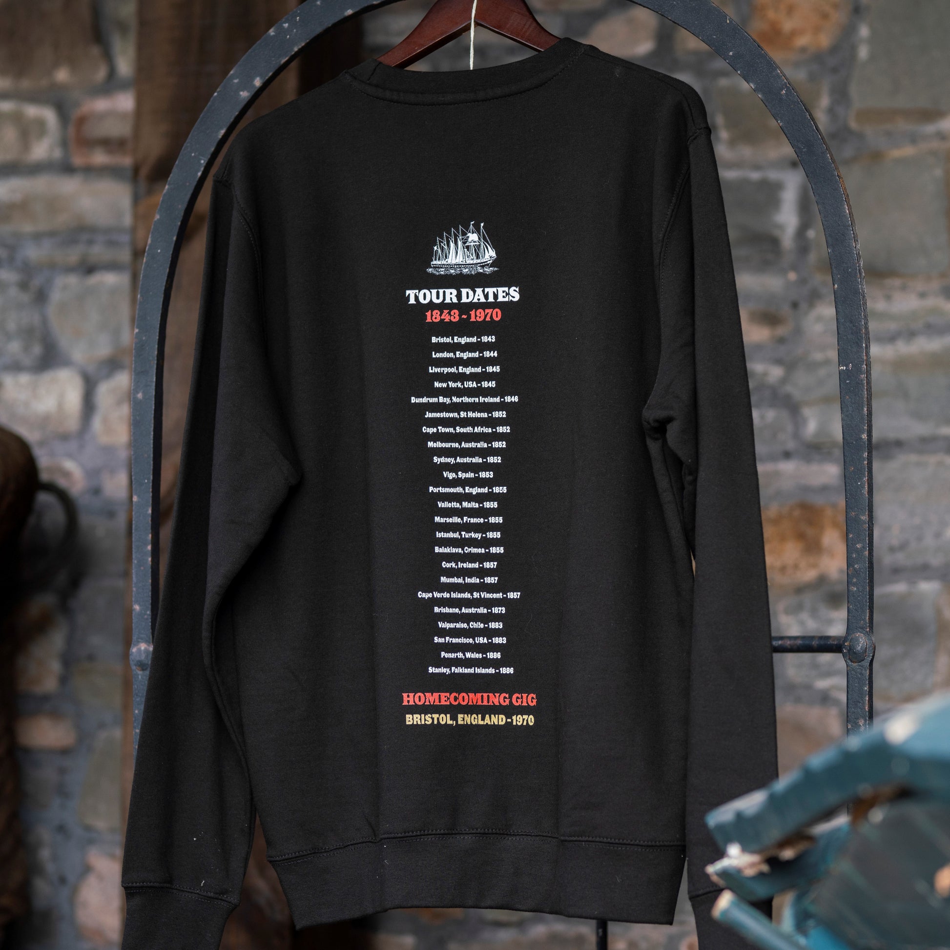 This sweatshirt features a nostalgic band style design of what must surely be the greatest world tour of all time! With the front of the design highlighting this famous ship's greatest hits, the back lists all the tour dates - locations in which Brunel's SS Great Britain dropped anchor in her lifetime.