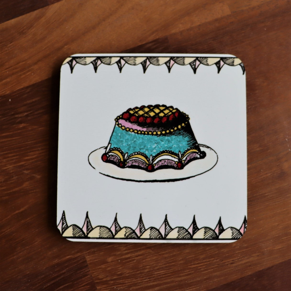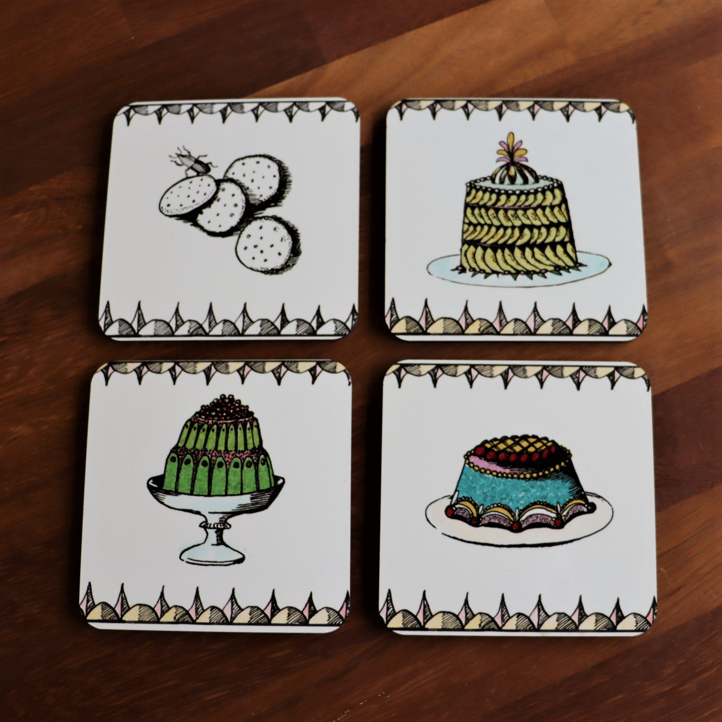 These colourful coasters feature designs drawn by Bev Milward.