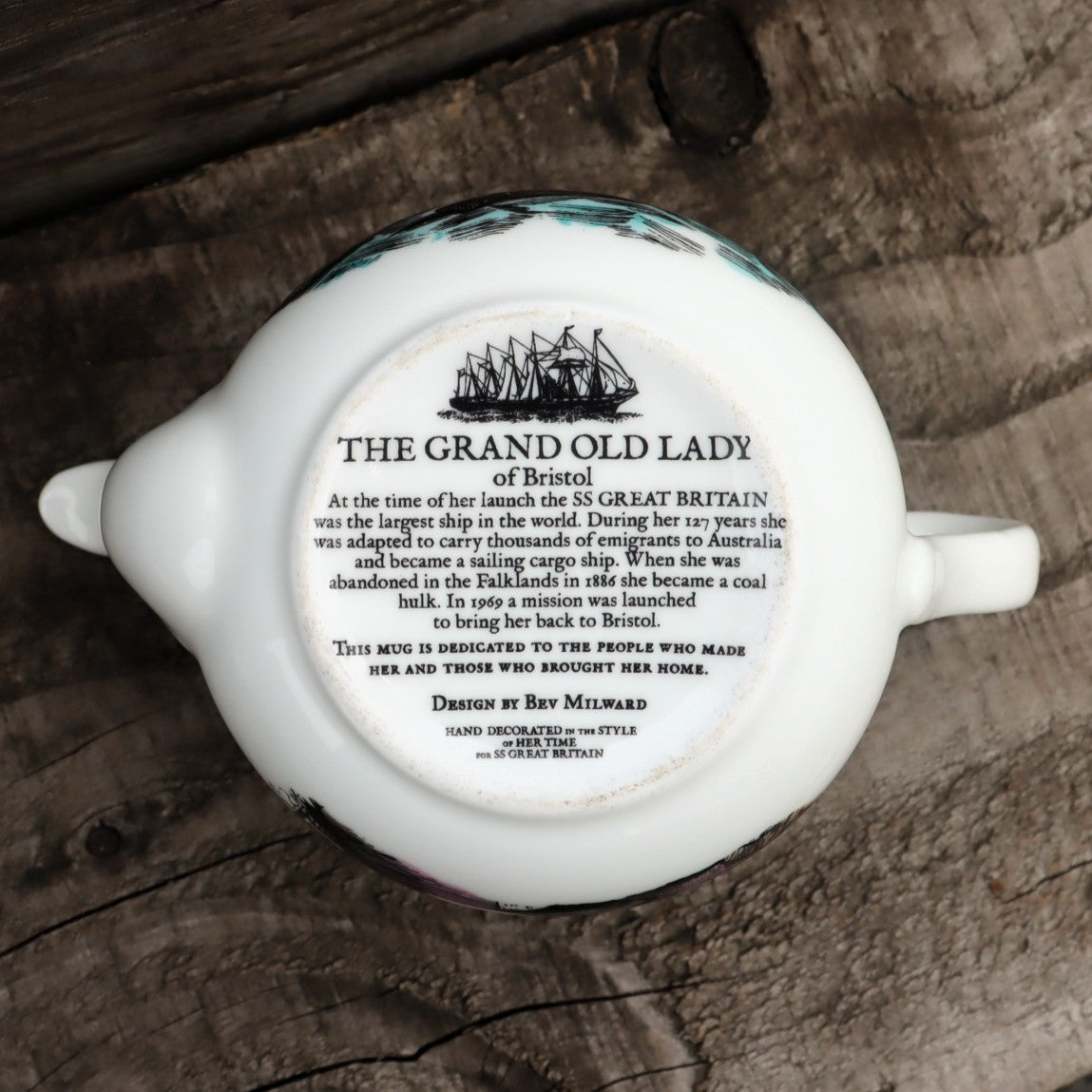 Bev has created these designs using images from both the SS Great Britain's archives and the ceramic archives at Stokes Croft China. Each piece has been hand decorated with ceramic transfers and copper lustre before firing. In addition, the teapots have hand-painted colour added to the images.
