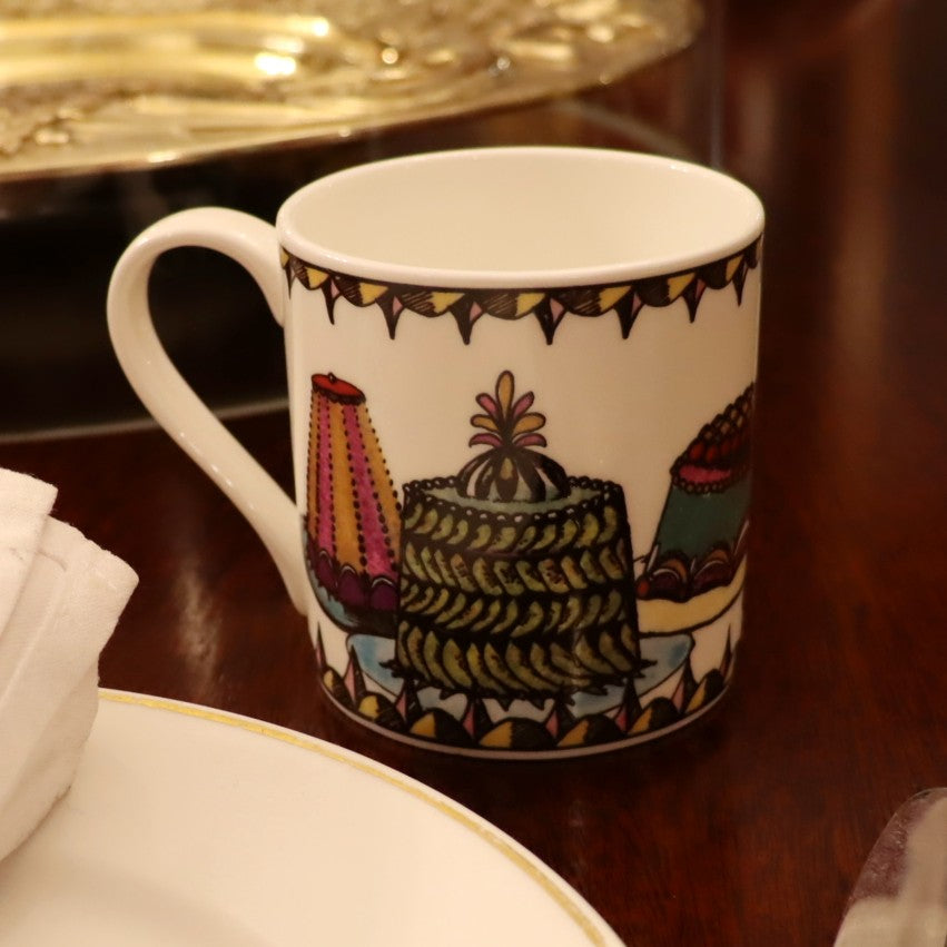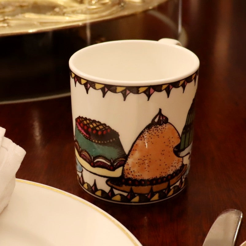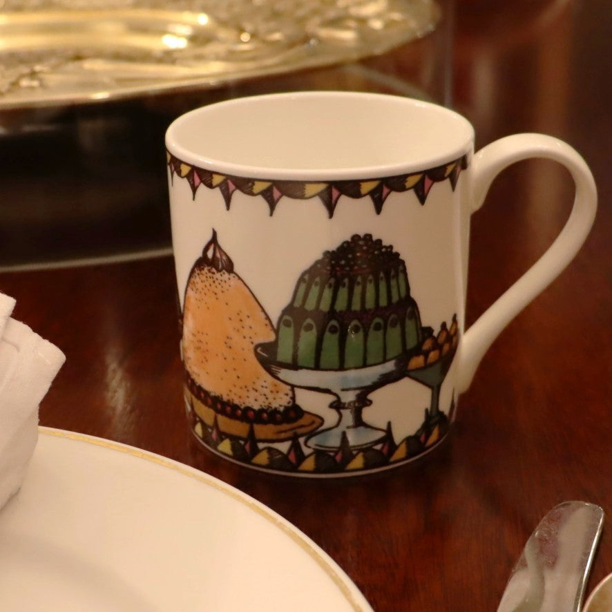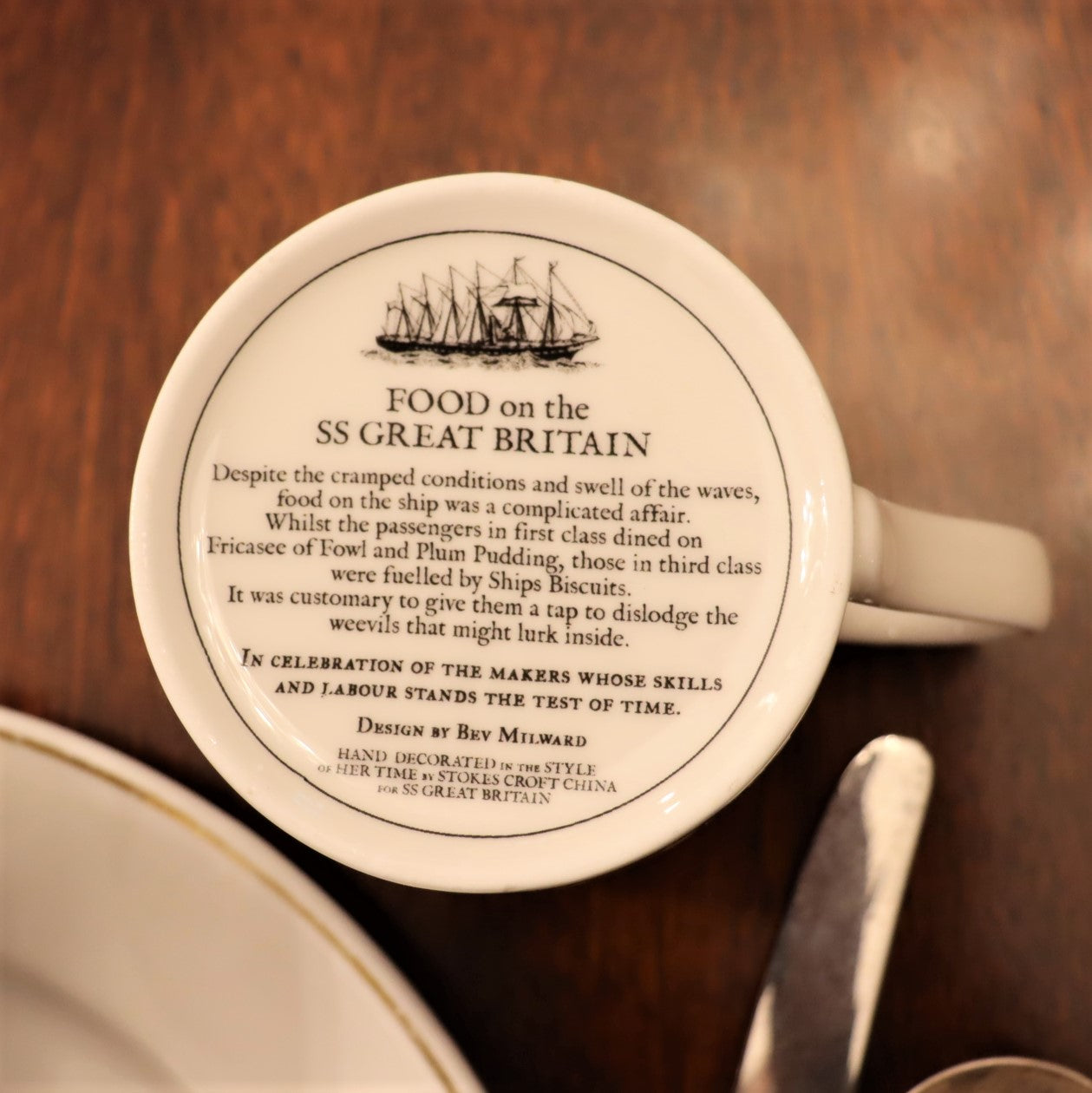 Designed in a collaboration between artist Bev Milward and the SS Great Britain, these unique china mugs feature a beautiful artist's impression of the puddings and cakes which would have been eaten by first class passengers at sea.