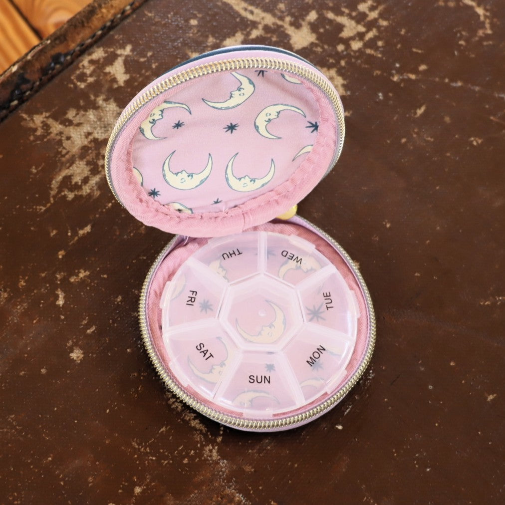 Brighten your everyday routine with this vegan leather travel pill case. Decorated in vibrant teal with a crescent moon design, it offers both style and reliable organization for your medications and vitamins.