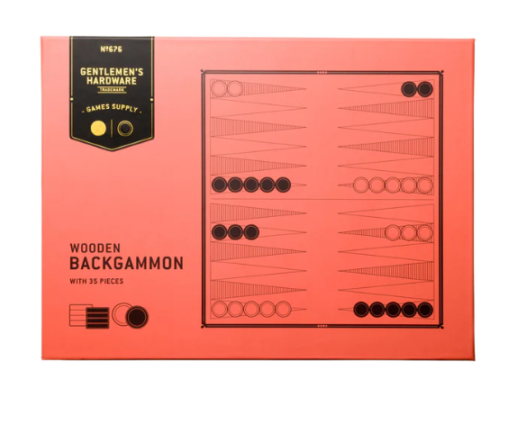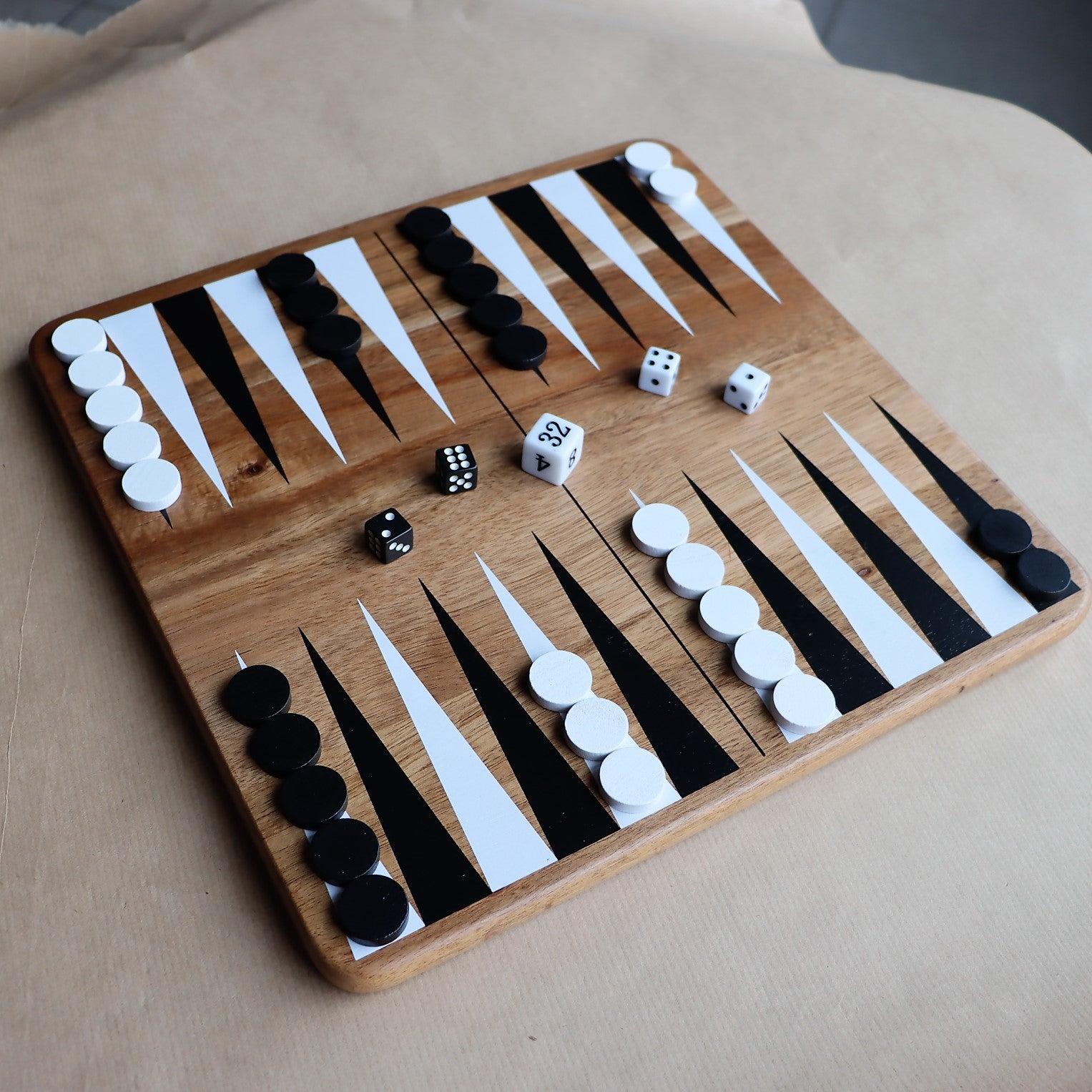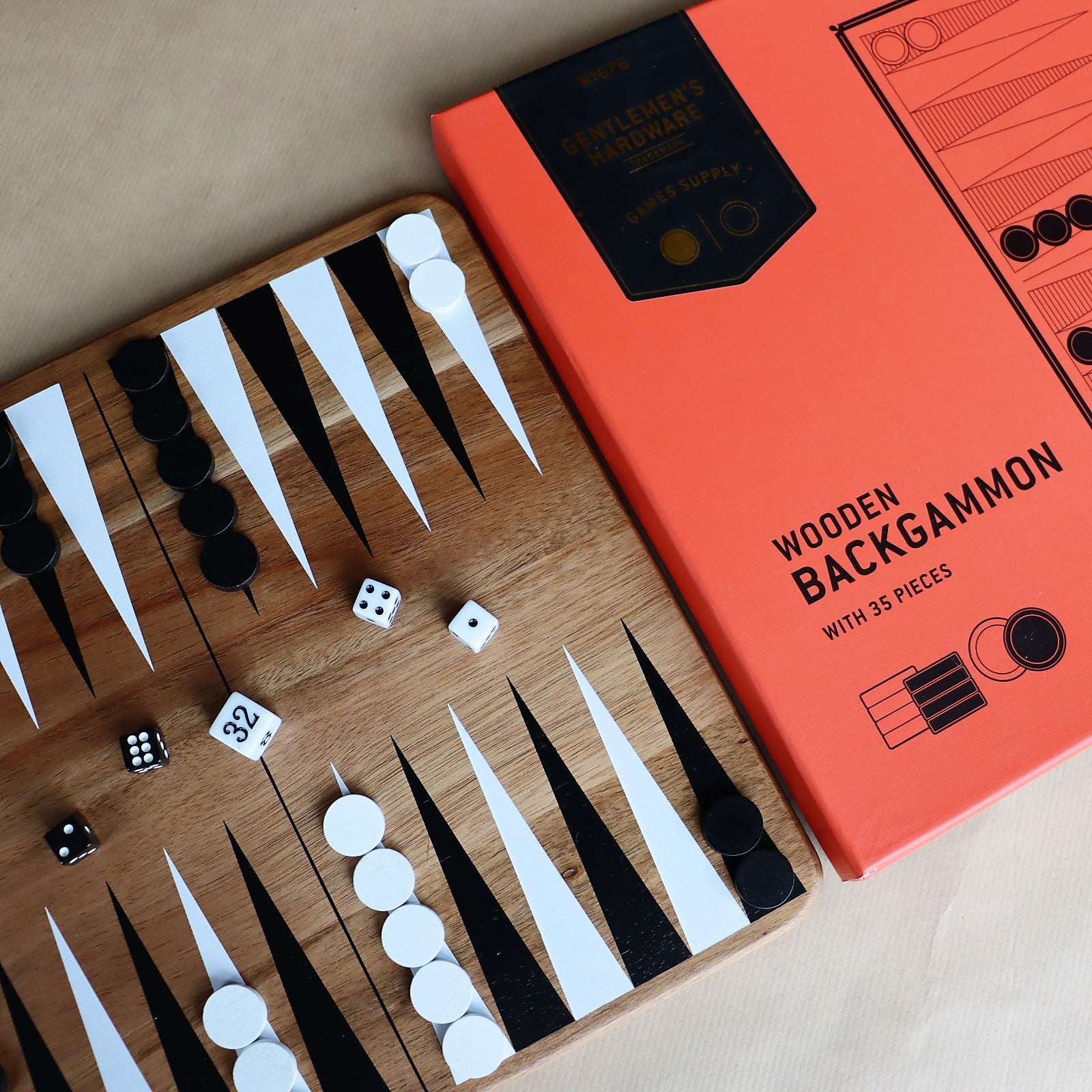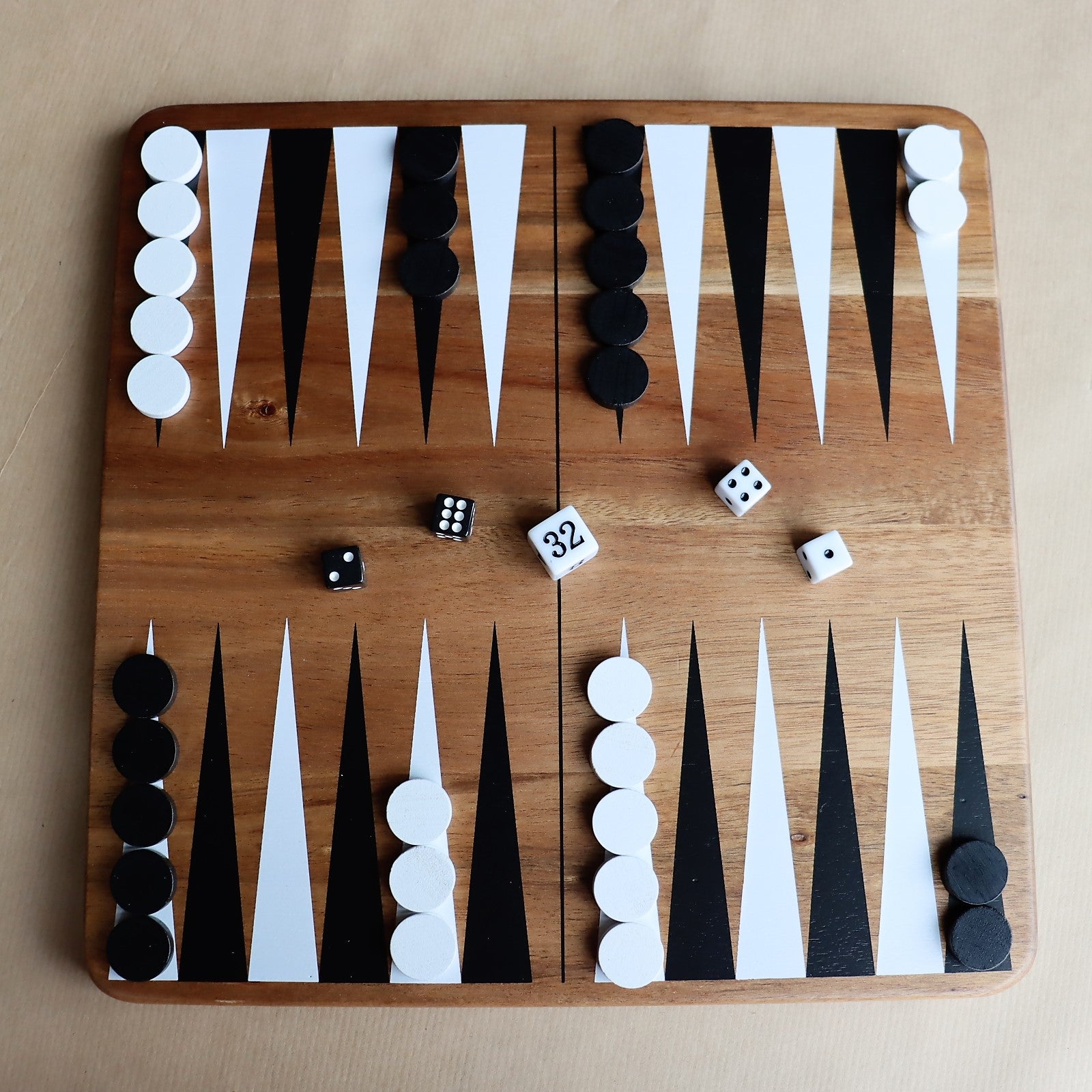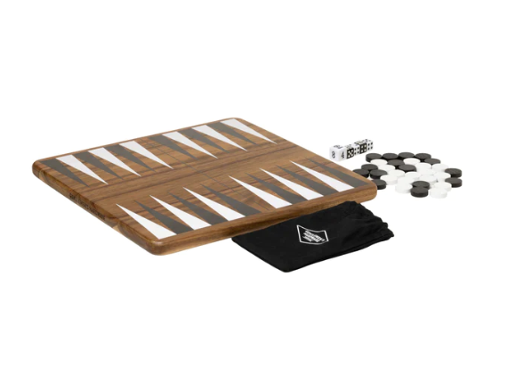 A two player game of strategy and luck, backgammon can be traced back nearly 5000 years. This luxury set includes an Acacia wood playing board, thirty wooden checkers, five dice, and a fabric pouch to store the pieces.