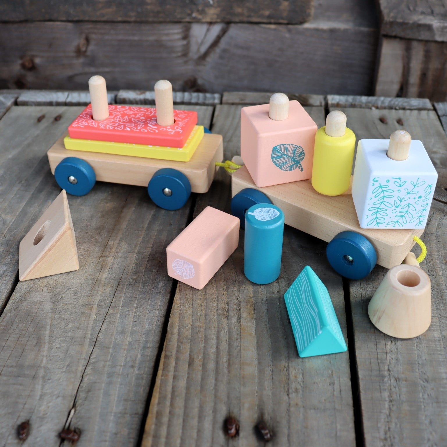 A delightful gift for babies and young children, this colourful wooden train set helps to develop imagination and fine motor skills. Children can rearrange the blocks in different combinations, then pull the train along!